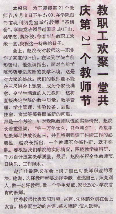 华信集团董事长李向阳先生出席典礼仪式,学院党委书记、院长赵国运教授发表重要讲话 [学院办公室]金秋送爽,瓜果飘香。9月9日上午8:30,万里长空,蓝天白云,南校区广场上彩旗飘扬,人头攒动,军乐队奏起喜庆的迎宾...