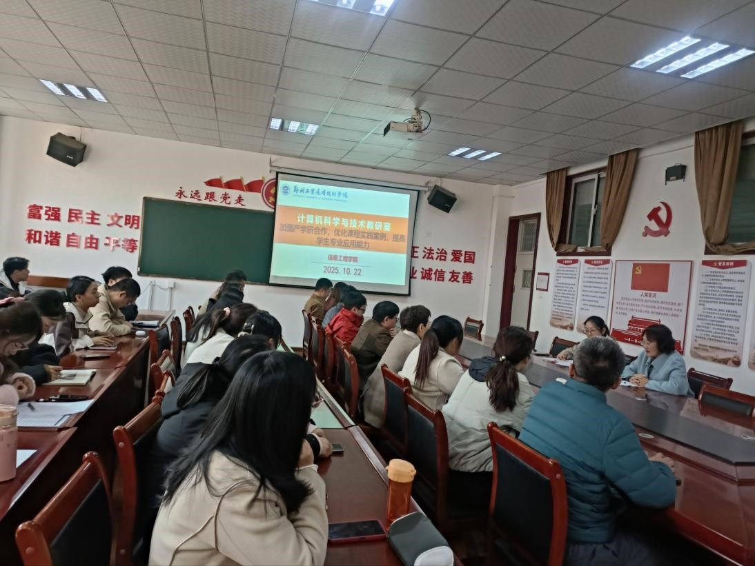 (文/张蒙萧 图/张鸿博)为进一步深化产教融合,提升学生专业应用能力,推动人才培养与行业需求精准对接,计算机科学与技术教研室于2025年10月22日下午15:00,在学院305会议室召开“加强产学研合作,优化课程实践案例,提高学生专业应用能力”专题研讨会。会议由教研室主任沈珍军主持,全体教师参会。