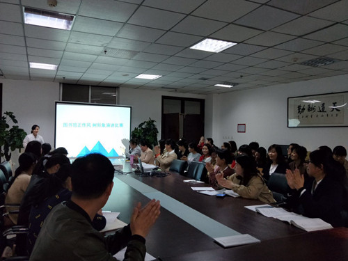 (文/高丹丹)为进一步贯彻落实学校“三风”建设会议精神,提升我馆教师自身素质,规范工作行为,增强工作效能,改进工作作风,建设一支学习型、服务型、廉洁型和规范型的工作队伍,4月24日下午,图书馆在一楼办公室举行了一场主题为“正作风 树形象”的演讲比赛。