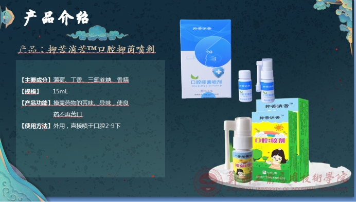 除了传统的比赛形式外,这次活动还特别提供了医学院苦药不苦项目组花费七年时间研发的“抑苦消苦”喷剂,这种产品既能缓解选手们在比赛过程中因为中药过苦所引起的的不适,又能够保证比赛的公平性与规范性,为比赛增加了更多趣味性和可玩性。同时,该喷剂对于身心疲惫者也有很好的辅助治疗效果,可谓一举多得。