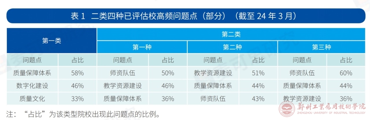 我们根据目前近180所已评校的专家意见交流会上专家反馈的本科教育教学问题点进行了简单的梳理和归纳,发现两类四种的评估类型院校其高频问题点均包括质量保障体系和质量文化的建设,其中质量保障体系建设均在前三位;相比第二类,第一类评估类型更加强调质量文化的建设效果。此外,对于第二类的三种类型校,师资队伍建设和教学资源建设工作也是排位相对靠前的高频问题点,具体包括高层次教师引培、教师教学能力提升、课程资源建设等方面(表1)。