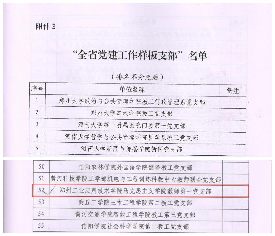 (文/高毓)近日,从中共河南省委教育工委印发的《关于公布全省高校党建工作强基引领“三级联创”评选结果的通知》(豫教工委〔2023〕70号)获悉,郑州工业应用技术学院马克思主义学院教师第一党支部被评为“全省高校党建工作样板支部”。