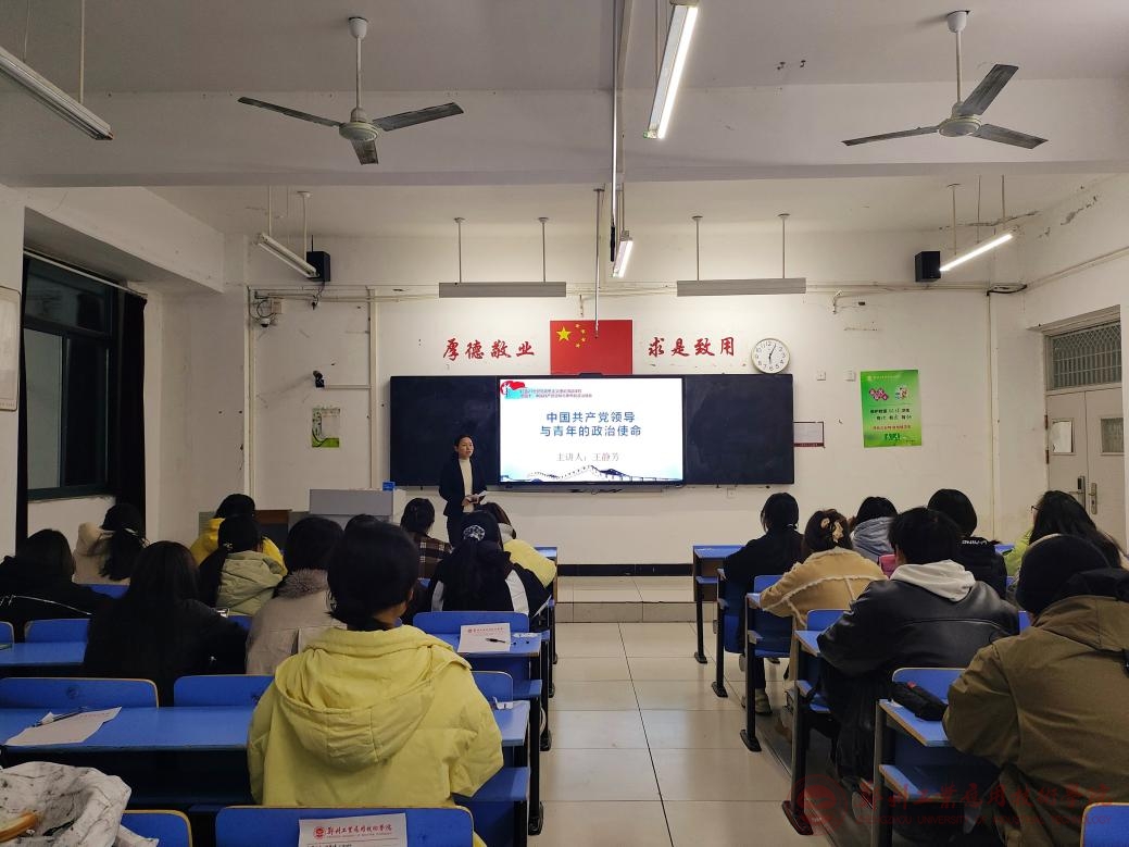为践行“党旗所指,团旗所向”的理想信念,激励广大青年牢记初心使命,踊跃投身强国建设,2024年12月5日,药学与化学工程学院在文华楼1-111开展了“青马工程”第四讲“中国共产党领导与青年的政治使命”。本次培训由王静芳老师主讲,“青马工程”培训班全体学员参加。
