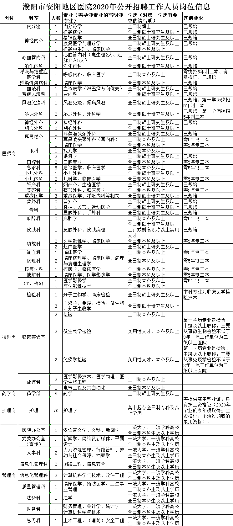 附件1:濮阳市安阳地区医院2020年公开招聘工作人员岗位信息表