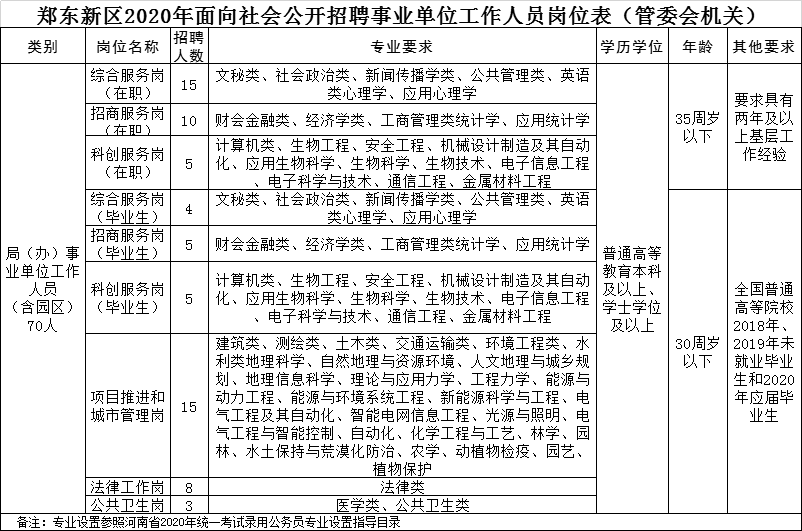 招聘管委会局(办)事业单位工作人员70名、乡(镇)办事处事业单位工作人员80名。具体招聘岗位、人数、资格条件等详见《郑东新区2020年面向社会公开招聘事业单位工作人员岗位表(管委会机关)》(附件1)、《郑东新区2020年面向社会公开招聘事业单位工作人员岗位表(乡镇办)》(附件2)。