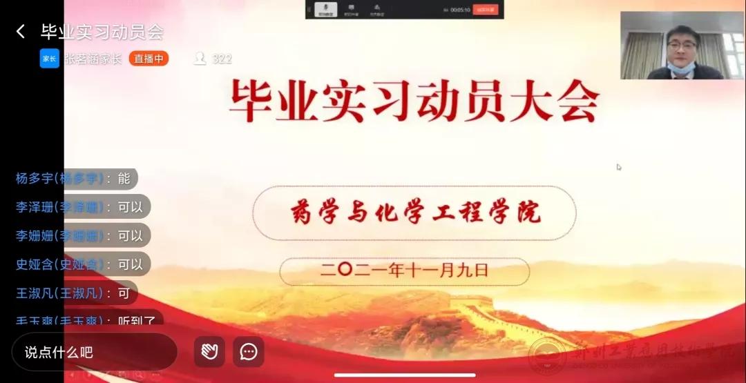 为做好毕业生实习工作部署,确保2022届学生高质量完成毕业实习和论文工作,切实提高人才培养水平。药学与化学工程学院于2021年11月9日下午以钉钉直播形式举行了2022届毕业生实习动员大会。此次动员大会的主持人为连创老师,出席会议的有尹卫平院长,蔡威副院长,张会丽副院长,谢新年副院长,许英教授,倪言言老师,刘亚萍老师,张家耀老师以及2022届毕业生。